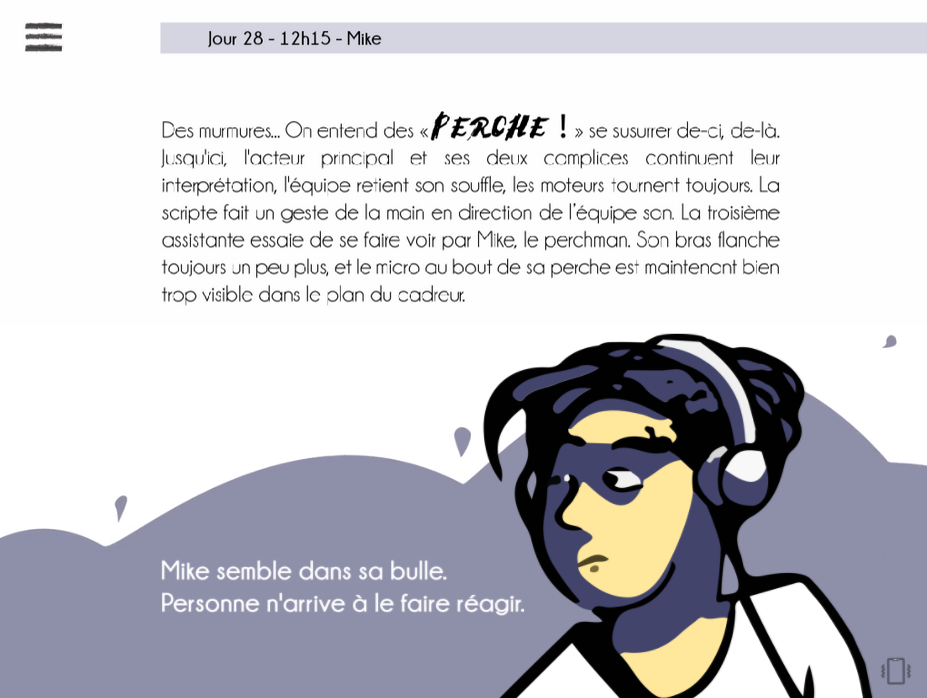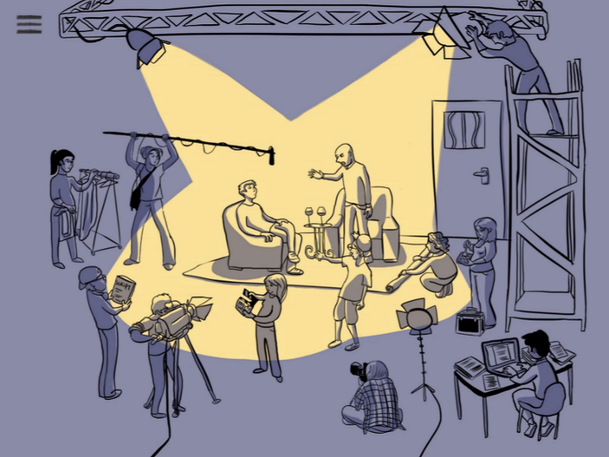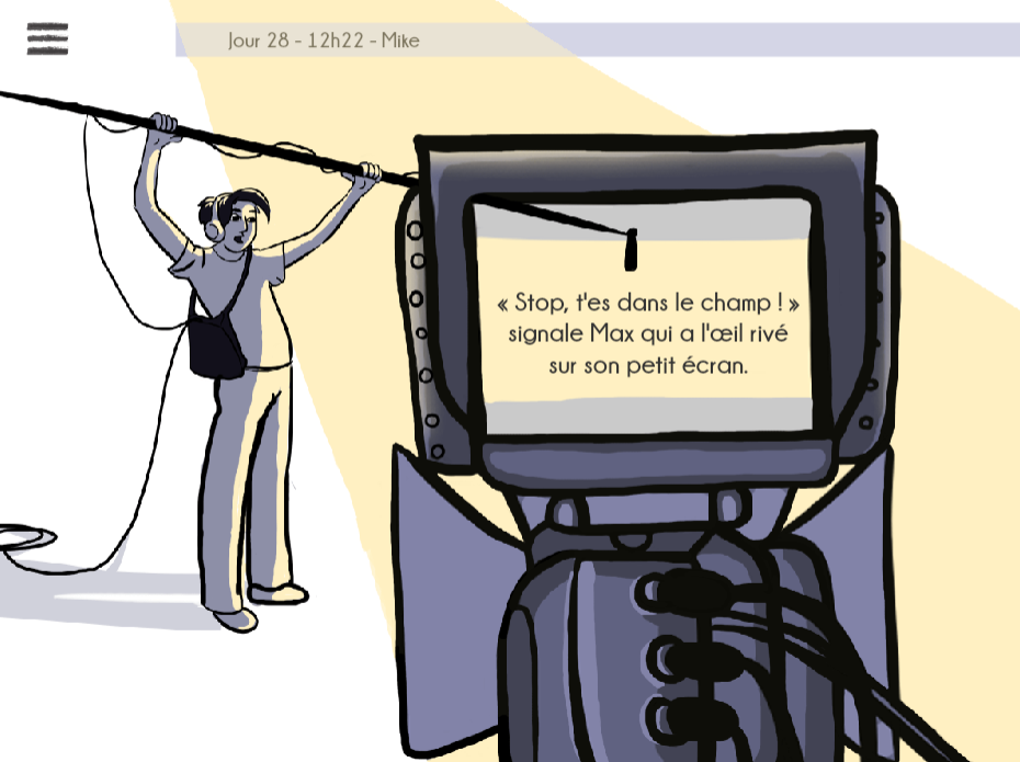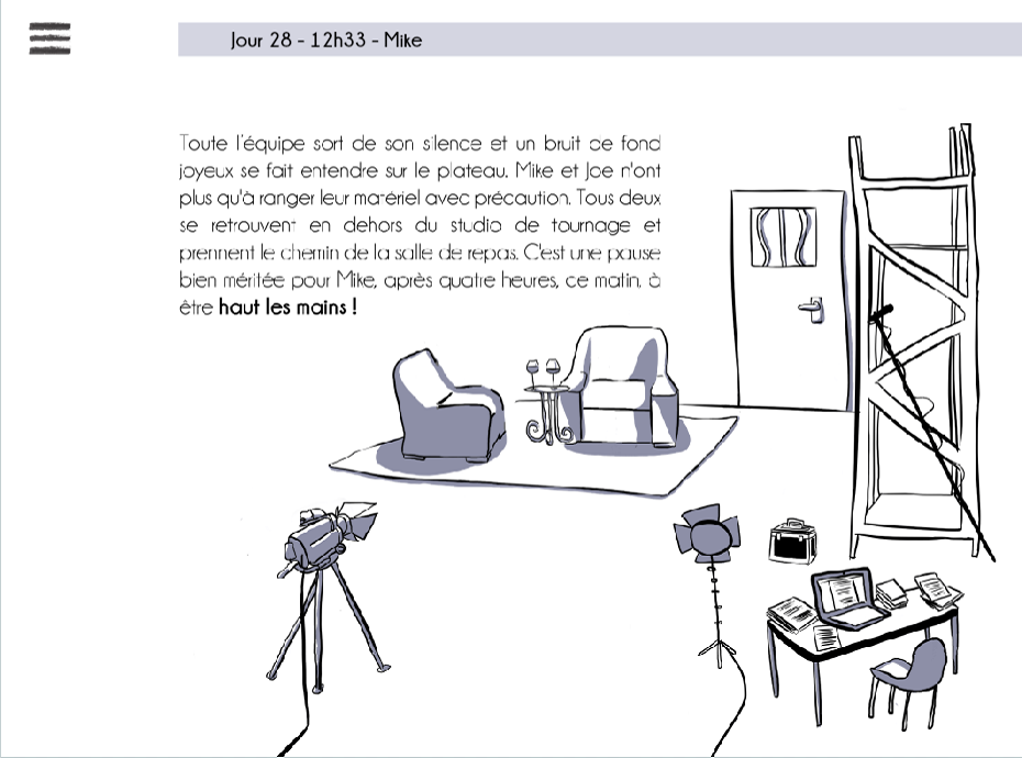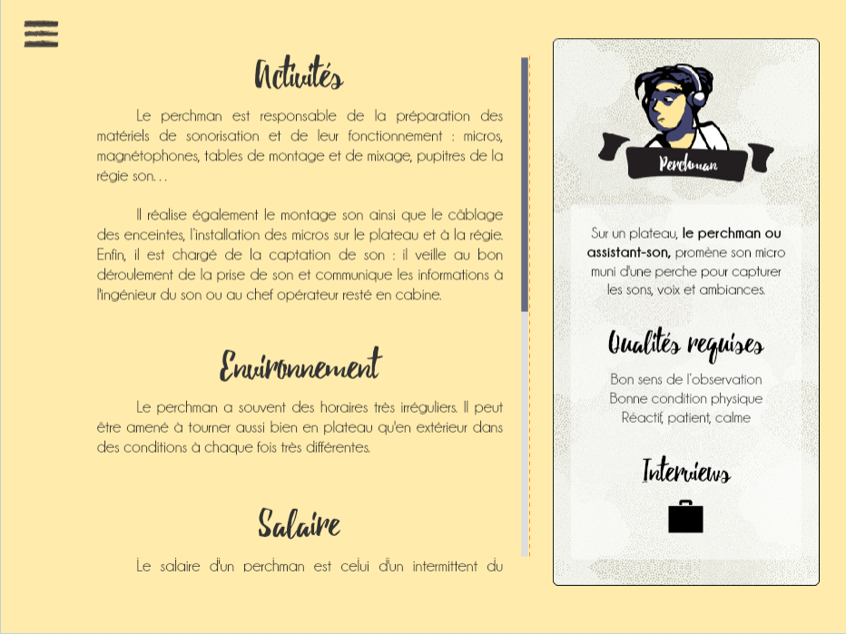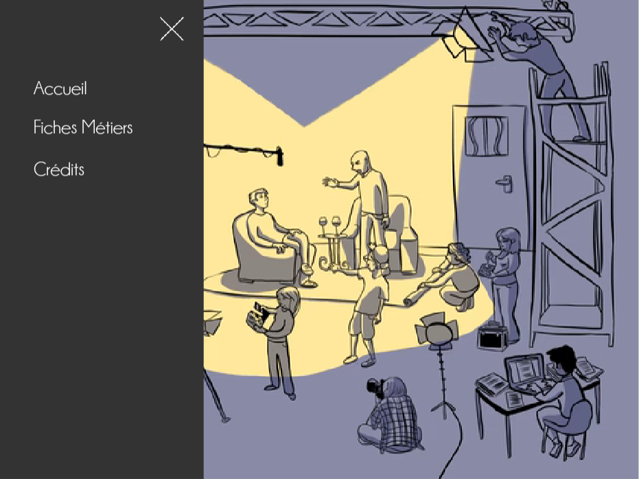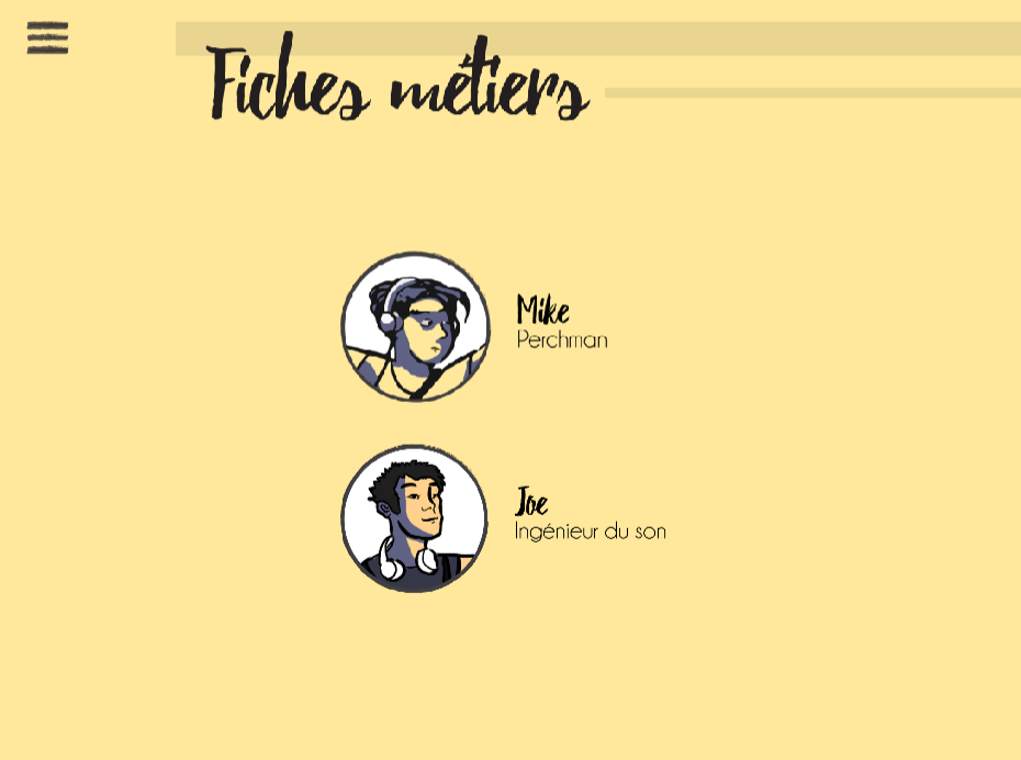 Ce projet porte sur les métiers du cinéma. Nous voulions présenter l'ensemble des métiers de cette industrie, les plus connus comme les moins connus à travers une histoire sur chacun des métiers. Notre objectif était d'informer et d'orienter les jeunes collègiens sur leur orientation future. Réalisation de l'application avec Pandasuite (pour visionner l'application, il faut être munie d'une tablette et télécharger PandaViewer).