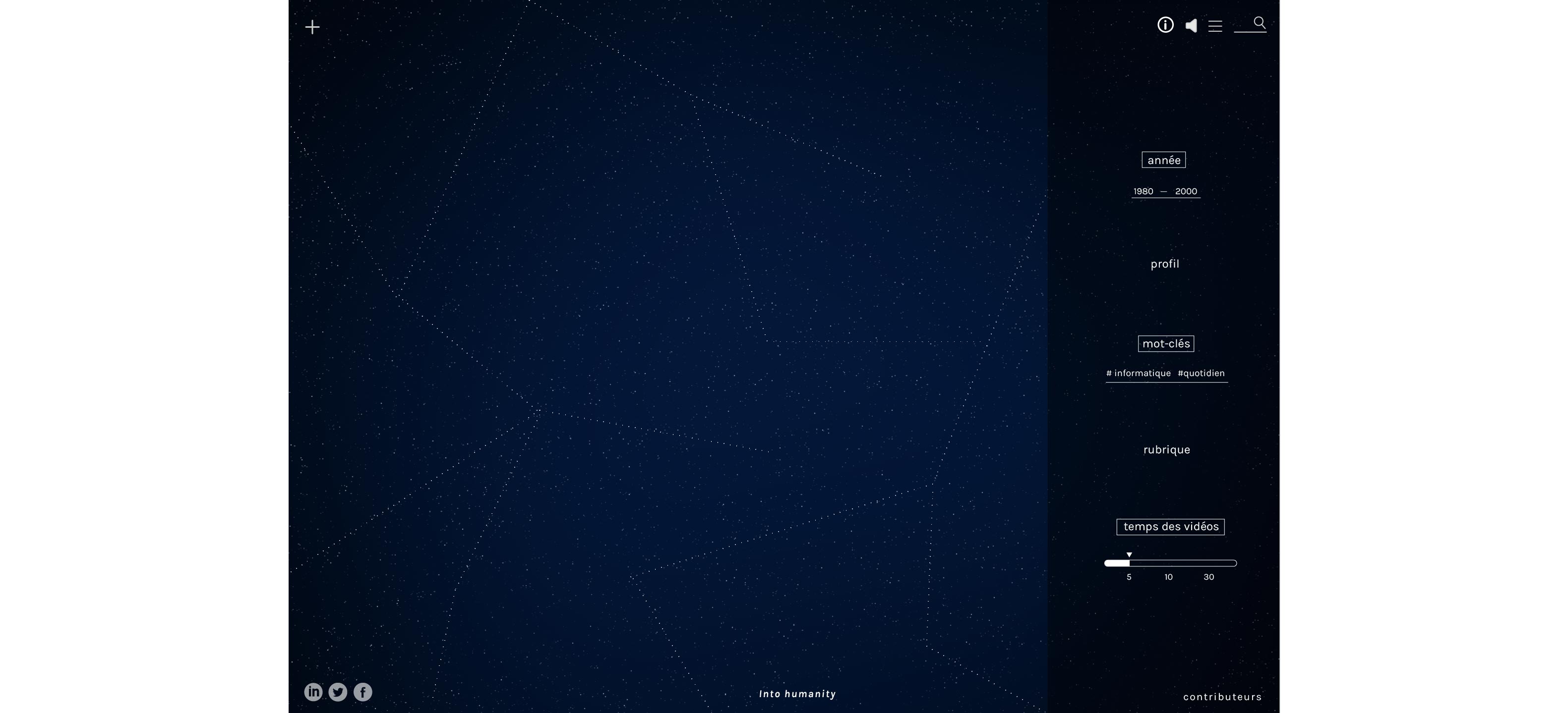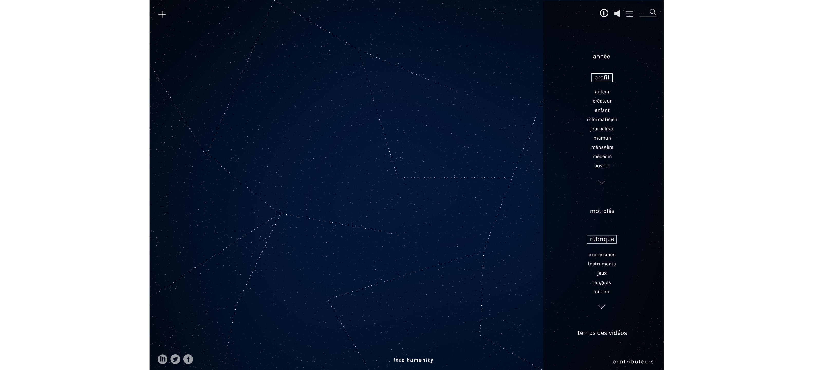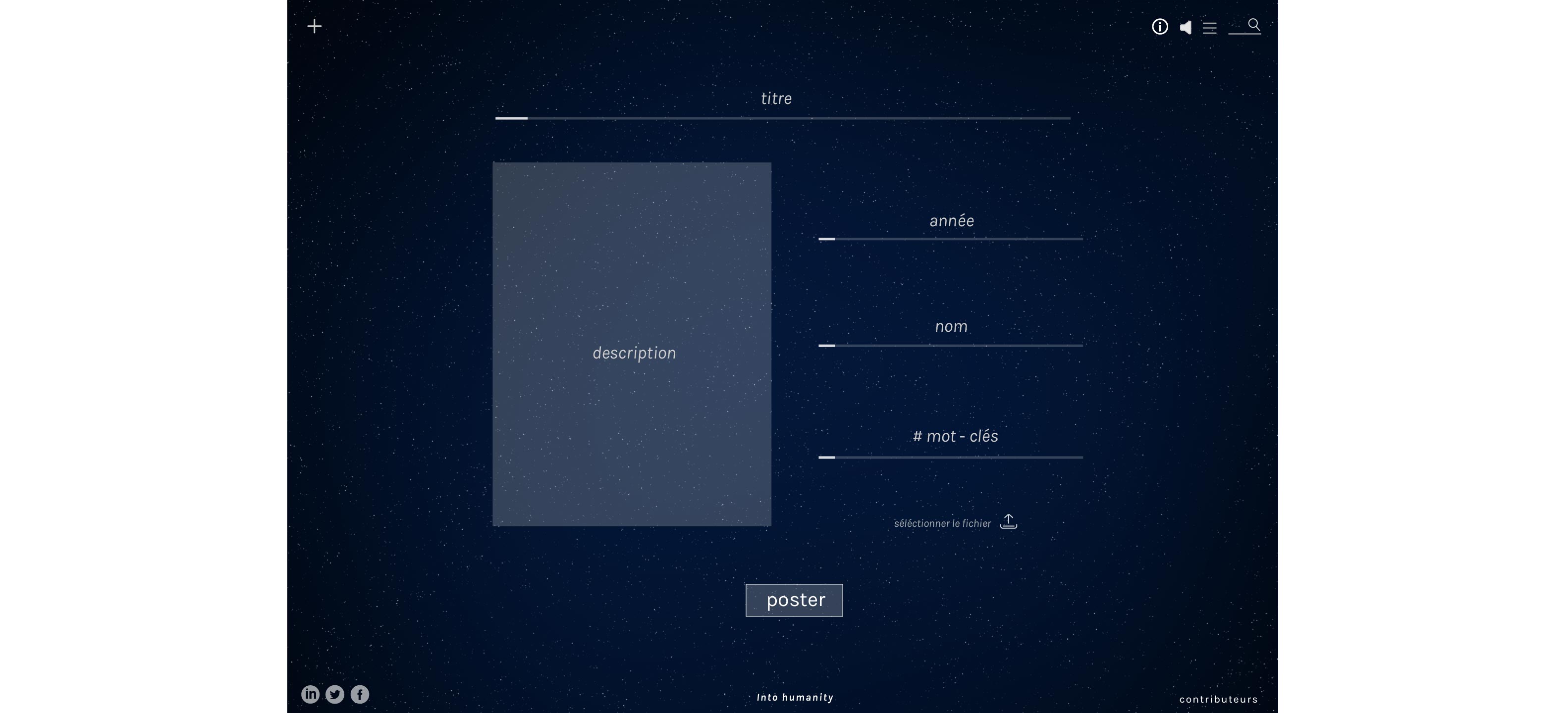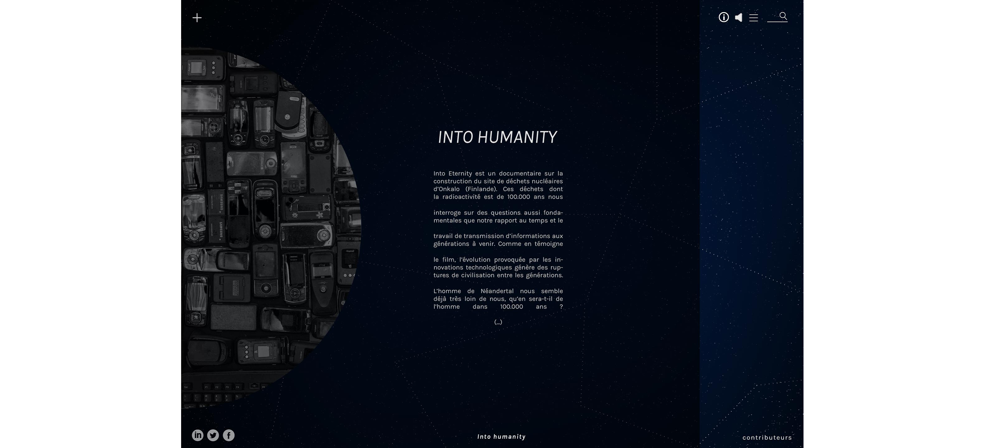 Into Humanity est un web documentaire traitant de l'obsolescence du savoir et des objets. L'objectif était d'avoir une quantité de "savoir" importante afin de valoriser des objets dont on ne sert plus aujourd'hui. Nous avons basé notre projet et nos recherches sur un autre documentaire : Into Eternity, traitant des déchets radioactifs à Onkalo.
